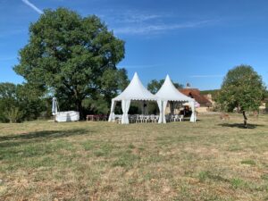 Pour cette magnifique réception familiale, nous avons installé dans ce beau parc arboré 2 tentes cottages garden 4×4 soit 32 m2 sans plancher.