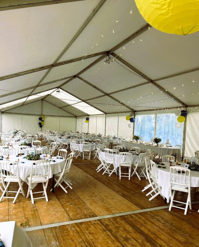 La structure choisie était un chapiteau traditionnel avec plancher bois, rideaux transparents et guirlandes lumineuses de type guinguette. Ce type d’installation crée une ambiance chaleureuse et élégante, idéale pour recevoir les invités dans un cadre convivial.