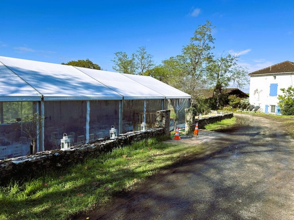 À l’occasion d’un mariage en octobre, nous avons installé un chapiteau de 250 m² (10 x 25 m) dans un jardin familial proche de Cahors, dans le Lot.