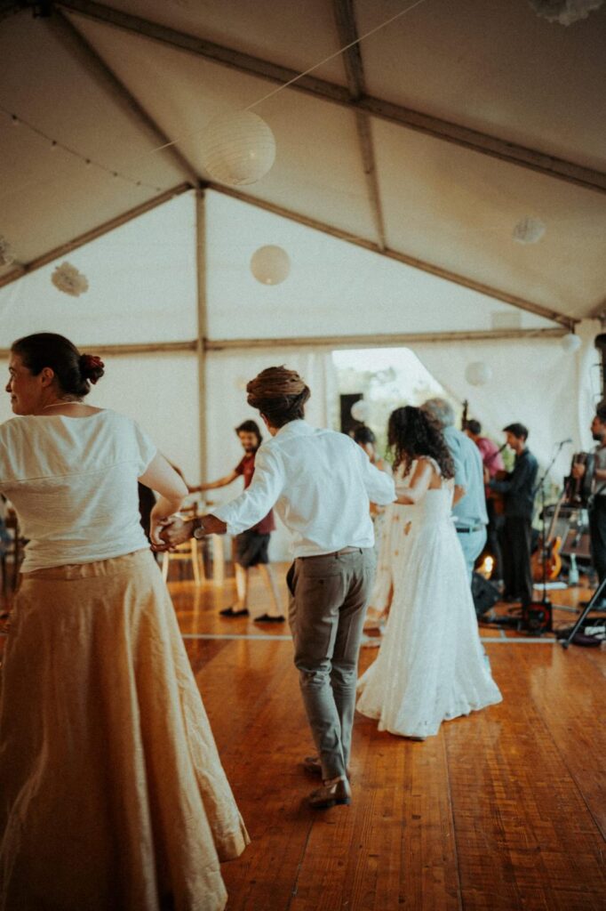 Bien que le terrain ne soit pas parfaitement plat, notre système de plancher a permis de rattraper les irrégularités du sol, garantissant ainsi une surface entièrement plane pour le confort des invités, que ce soit pour le repas, la réception ou la soirée dansante.
