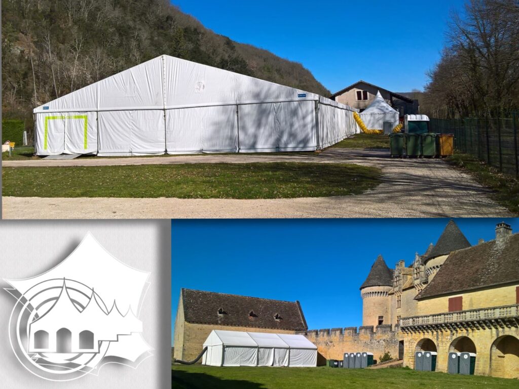 Nous sommes actuellement présents dans le département de la Dordogne où nous avons installé plusieurs tentes, chapiteaux et barnums à l’occasion d’un tournage de film.