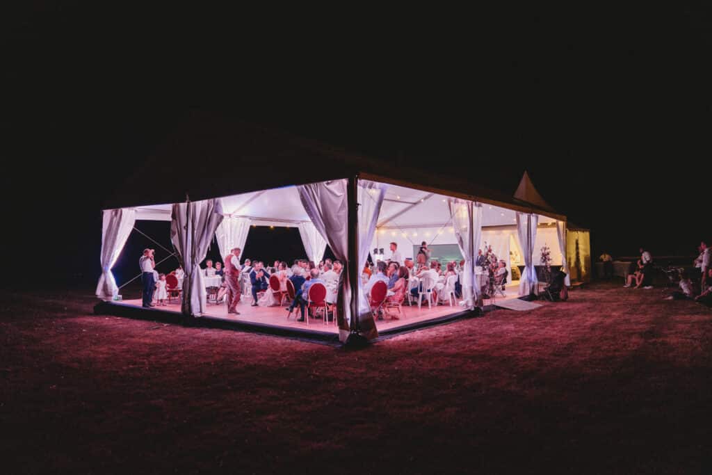 Le chapiteau, doté d’un toit blanc lumineux et de rideaux transparents, laissait pénétrer la lumière naturelle tout en préservant une esthétique soignée et romantique. Pour sublimer la soirée, nous avons ajouté un éclairage guinguette, créant une ambiance chaleureuse, festive et intimiste jusque tard dans la nuit.