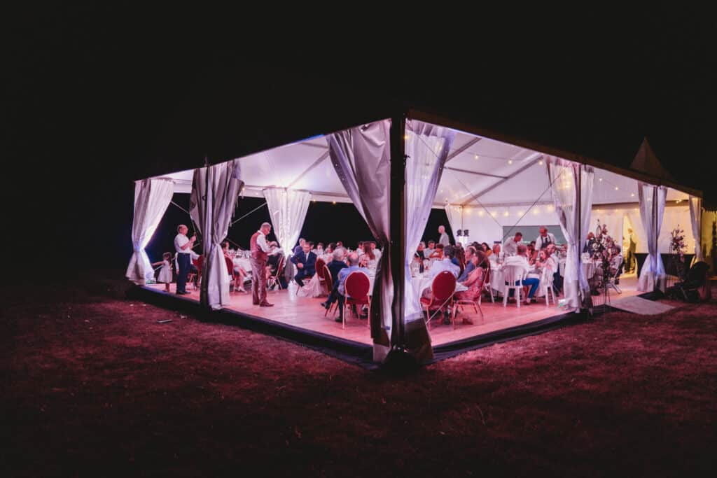 Afin de faciliter le service et l’organisation de la réception, une tente Cottage Garden 5×5 m avec plancher a été installée en extension du chapiteau, spécialement dédiée à l’office traiteur. L’ensemble formait un espace harmonieux et fonctionnel, garantissant un confort optimal pour les invités et les prestataires.