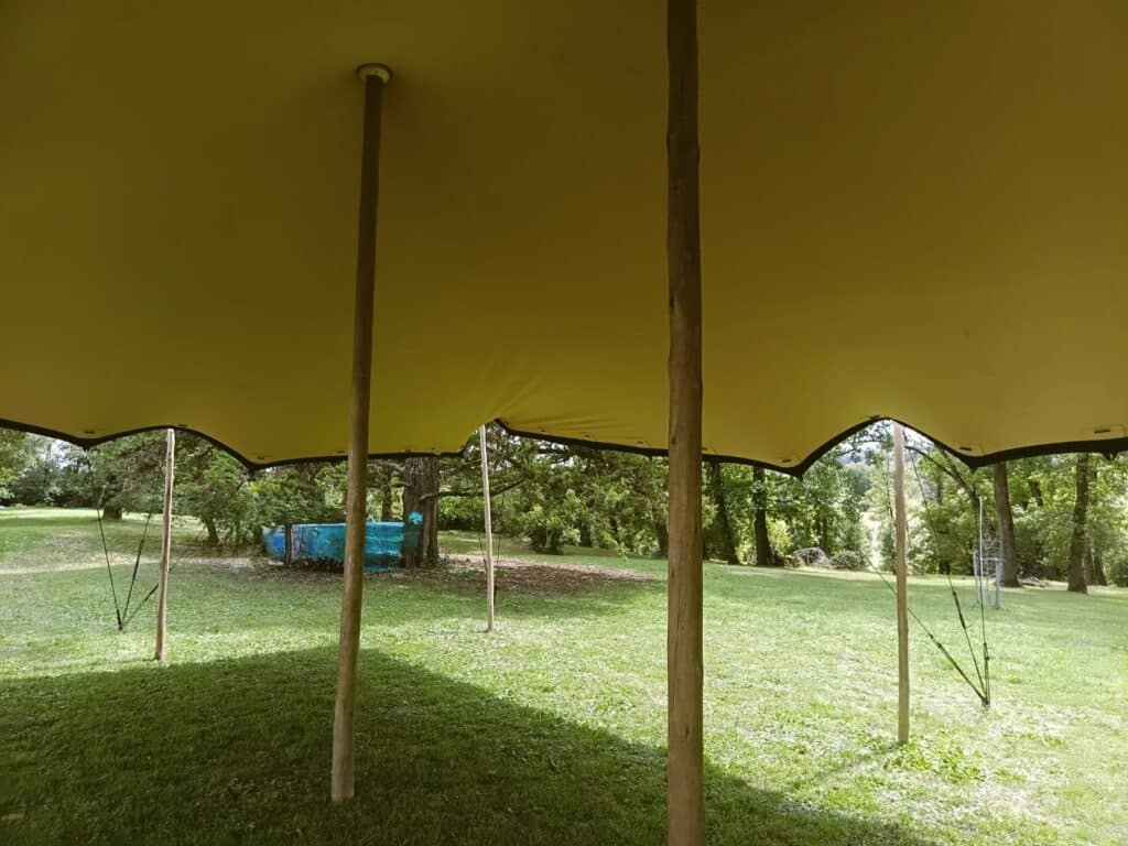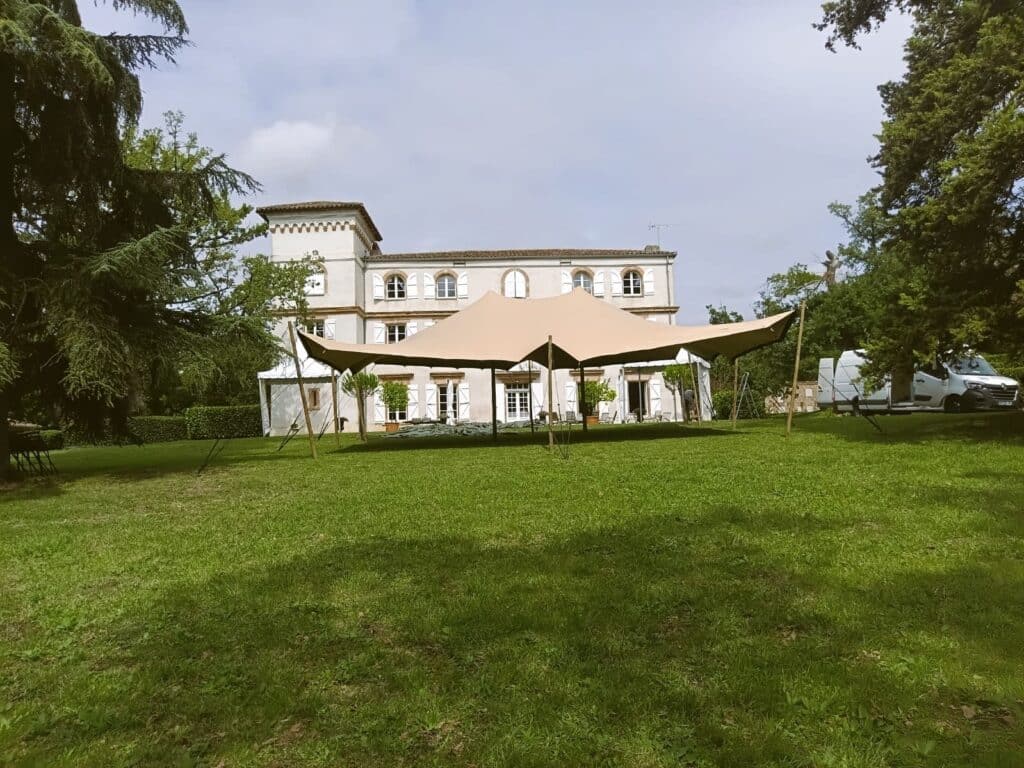 Nous avons eu le plaisir d’installer une tente stretch de 80 m² dans un magnifique domaine privé situé à proximité d’Albi, dans le Tarn. Cette toile nomade élégante, soutenue par un ensemble de poteaux en bois, a permis de créer un espace chaleureux et convivial, parfaitement intégré à l’environnement naturel du lieu.